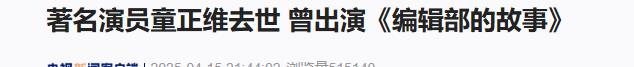 央视新闻:著名演员童正维去世 曾出演《编辑部的故事》
