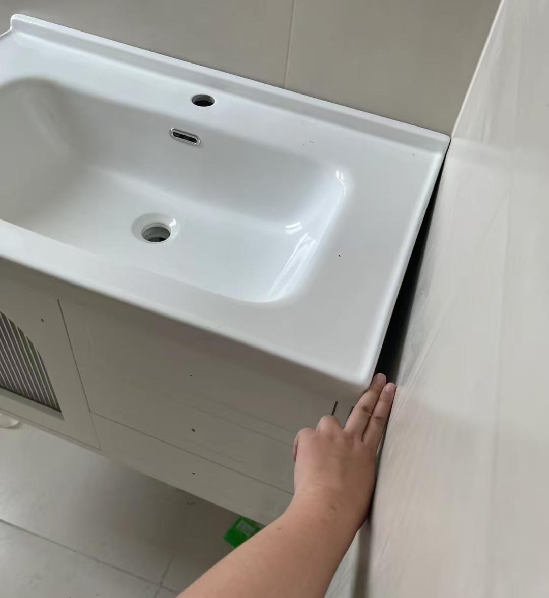 主卫的浴室柜只有两侧靠墙,不用担心尺寸问题,但是两面相连的墙布完全垂直,导致浴室柜装好后,紧贴后面的墙,侧面却多了一条宽宽的缝隙,这后期美缝都盖不住,太丑了。