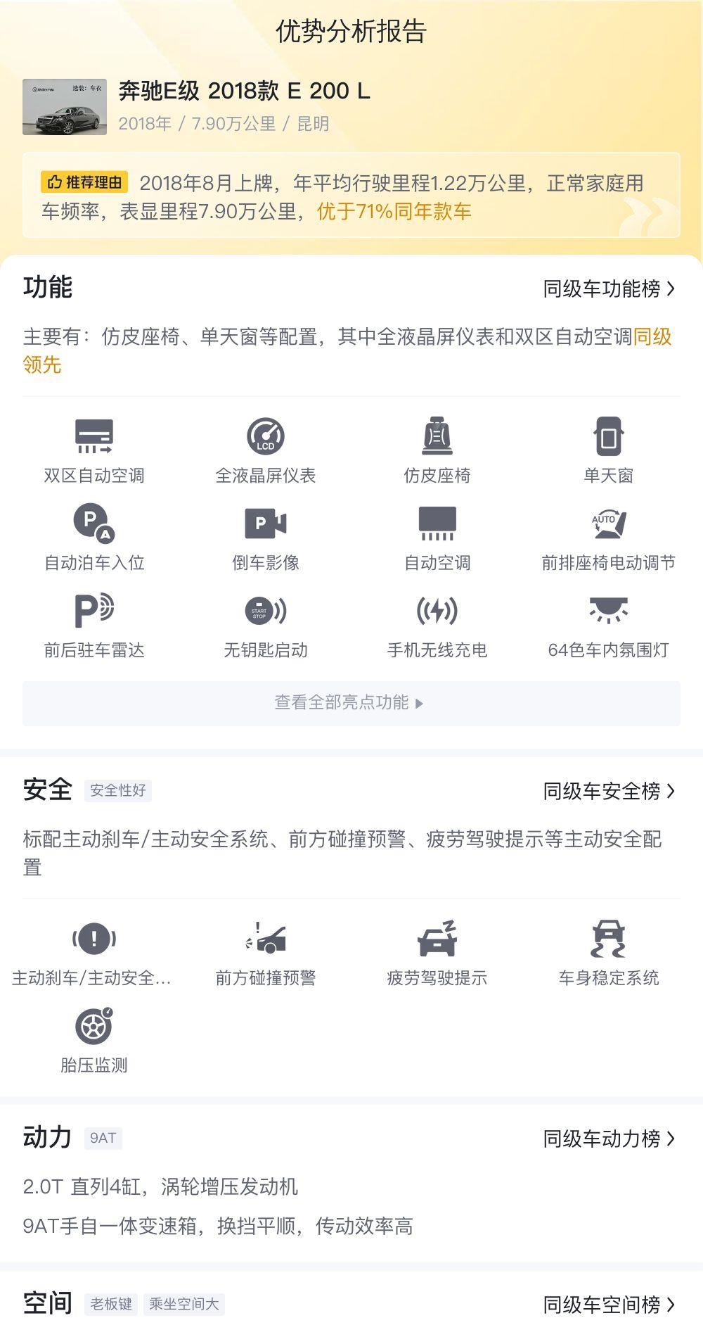 再次,这辆E200L的配置在同级别车型中依然具有竞争力。全液晶仪表盘、双区自动空调、车身稳定系统、胎压监测、7个安全气囊等配置,都能够提升驾驶安全性和舒适性。