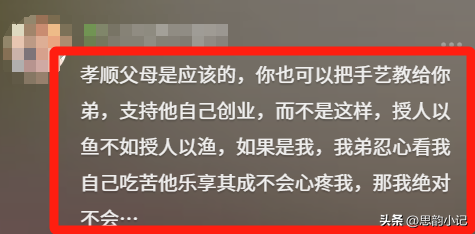 有网友还说:孝顺父母是应该的,你也可以把手艺教给你弟,支持他自己创业,而不是这样,授人以鱼不如授人以渔,如果是我,我弟忍心看我自己吃苦他乐享其成不会心疼我,那我绝对不会…