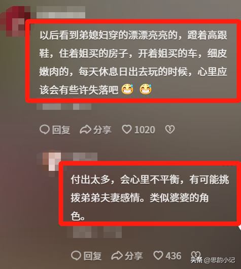 网友还表示:以后看到弟媳妇穿的漂漂亮亮的,蹬着高跟鞋,住着姐买的房子,开着姐买的车,细皮嫩肉的,每天休息日出去玩的时候,心里应该会有些许失落吧。