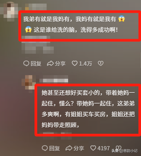 有网友表示:我弟有就是我妈有,我妈有就是我有,这是谁给洗的脑,洗得多成功啊!