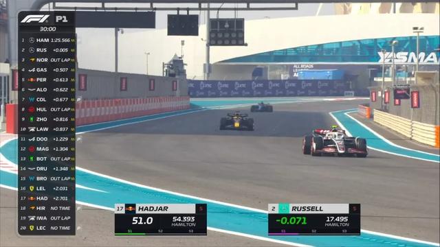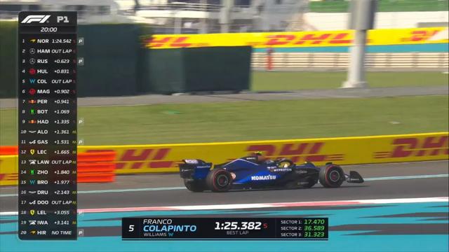 F1阿布扎比大奖赛一练于北京时间17:30开始,在这节练习赛中有6位新秀车手登场:平川亮-迈凯伦,阿蒂尔·勒克莱尔-法拉利,伊萨克·哈贾尔-红牛,费利佩·德鲁戈维奇-阿斯顿·马丁,岩佐步梦-红牛二队,卢克·布朗宁-威廉姆斯。