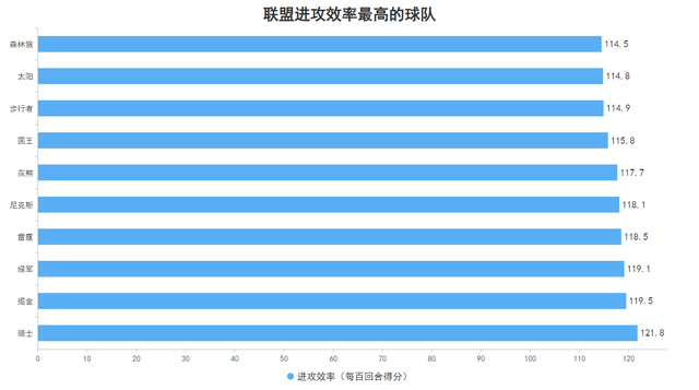 骑士本赛季的进攻效率达到了121.8,这意味着骑士每百回合的得分达到了联盟最高的121.8分,这个进攻效率为联盟30队的最高。
