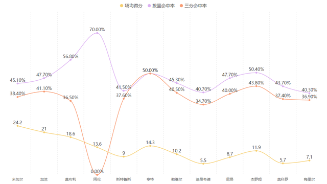 从进攻端来看,骑士本赛季场均出战19分钟以上包括已经离队的球员多达12人,并且这12名球员的得分没有过于低效的:每人都有着至少场均5分以上的贡献,除去不投三分的阿伦其余球员的两项命中率均高于40%与34%,这意味着在骑士队内每个球员都具备着得分并且相对较为高效的属性,这样的主力表现自然也令球队的进攻极为强大。