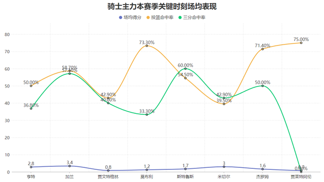 除此之外骑士还有另一项特殊的能力,那就是关键时刻的攻防表现还会更进一步。当到了最后5分钟并且分差小于5分的关键时刻,骑士关键时刻场均出战两分钟以上的8名主力没有一人可以用低效来形容,几乎全员都有着稳定的赛场表现,这样的关键时刻进攻能力也令骑士队本赛季关键时刻的表现达到了夸张的地步。