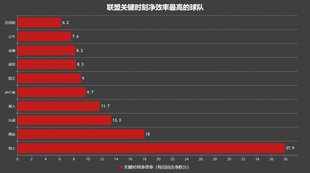 本赛季骑士关键时刻的进攻效率提升到了139.5,在联盟30队中保持着断档式的领先,虽然关键时刻的防守依旧弱于进攻,但在结合防守效率后他们在关键时刻每百回合的净胜分依旧高达37.9,这个关键时刻的净胜分依旧断档式的领先于全联盟。