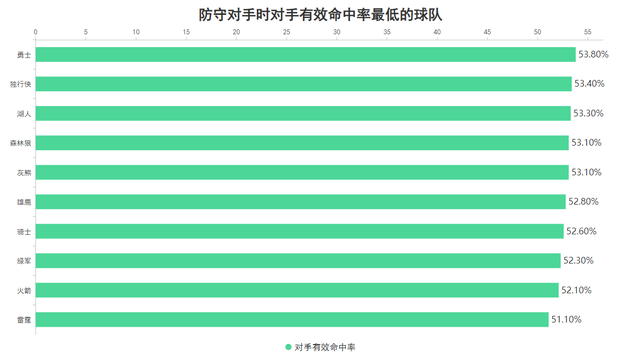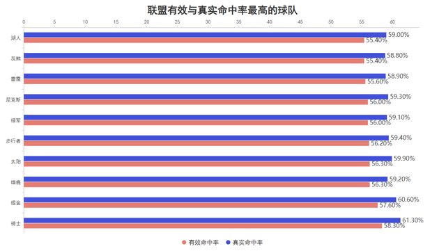 检验进攻水准除了每百回合的得分数外,得分的命中率也非常重要,骑士本赛季的运动战也就是结合三分出手情况后的有效命中率为58.3%,结合三分与罚球后的真实命中率为61.3%,有效与真实命中率全部位于联盟30队的最高。
