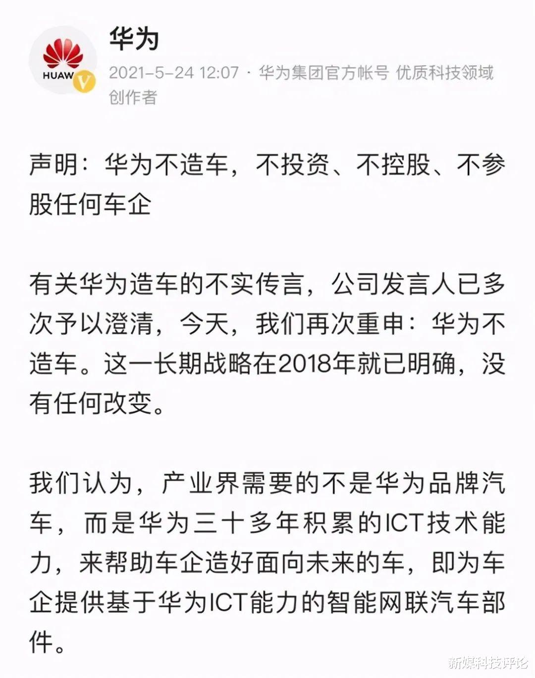 华为曾经说过他不造手机的,还曾经说过他不造电视的,现在他又说不造车[呲牙笑][呲牙笑] 任老都曾经说过,华为只是个公司,只是个商人,你们为什么要把他神化呢?