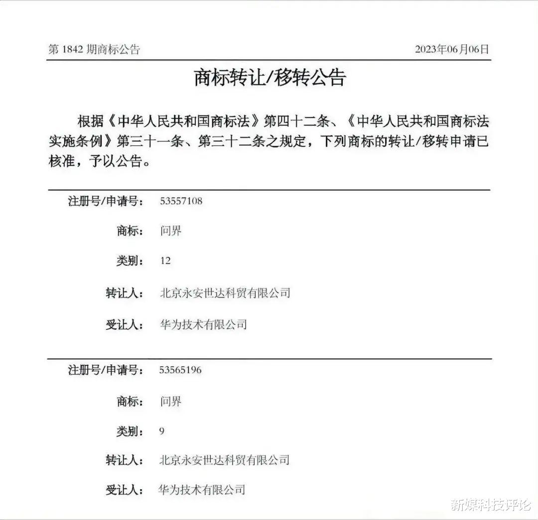 作为华为与赛力斯共同创造的“心血结晶”,问界汽车完整的品牌名称是“AITO问界”,其中“AITO”商标一直都是赛力斯的,但“问界”商标最早是属于华为、赛力斯以外的第三方公司——北京永安世达科贸有限公司。不过在2023年,这个公司已经正式将商标转移给华为。