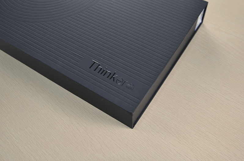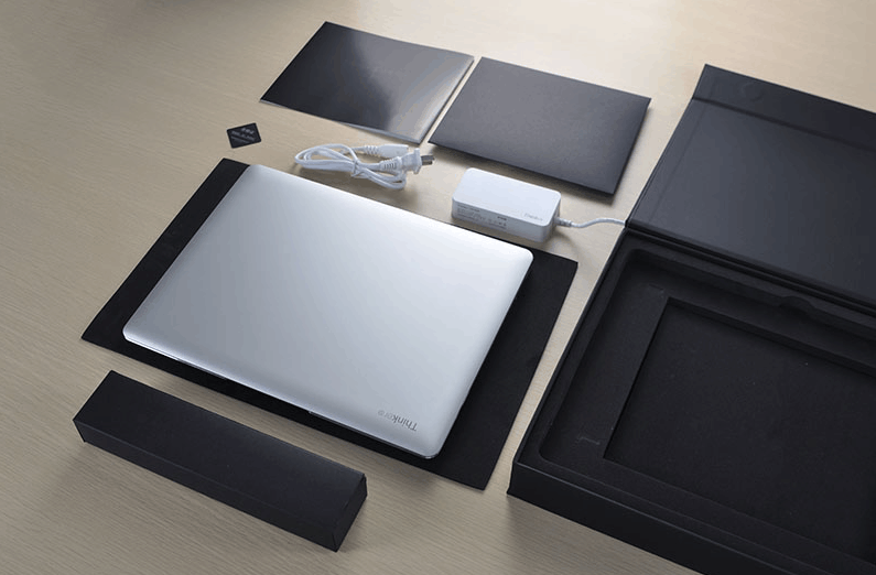 Thinker这款笔记本外观看着非常简约,银白色的金属机身透露着一种奢华的品质,我感觉Thinker这款笔记本特别漂亮,黑色的硬质外包装盒非常有质感,包装盒里面依次陈列着笔记本、充电器、说明书等重要配件。