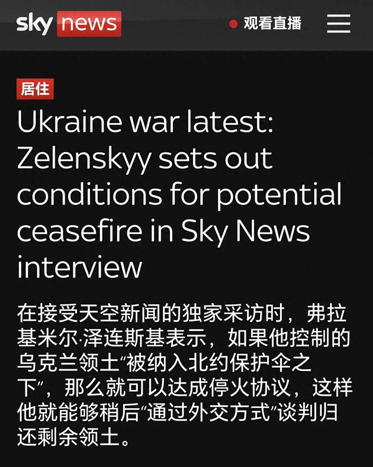 泽连斯基在接受天空新闻采访的时候说,如果北约现在能把还在乌克兰手里的领土纳入北约的保护之下,也就是将乌克兰纳入北约,那就可以停火了。到时候,乌克兰跟俄罗斯慢慢谈判领土问题,你欧洲也不必担忧冲突升级被卷进去了,你们看这个想法怎么样?你北约把乌克兰扩进去了,北约第五条款:成员国被打的时候,其他成员国有权一同反击。那俄罗斯就不敢打了啊,停战不就顺理成章了。关于领土问题,乌克兰也咬的很死,不会放弃任何领土,可现在乌克兰有18%被俄军占着呢,乌克兰就不愿意停战,两方僵持着,其中乌方占劣势。