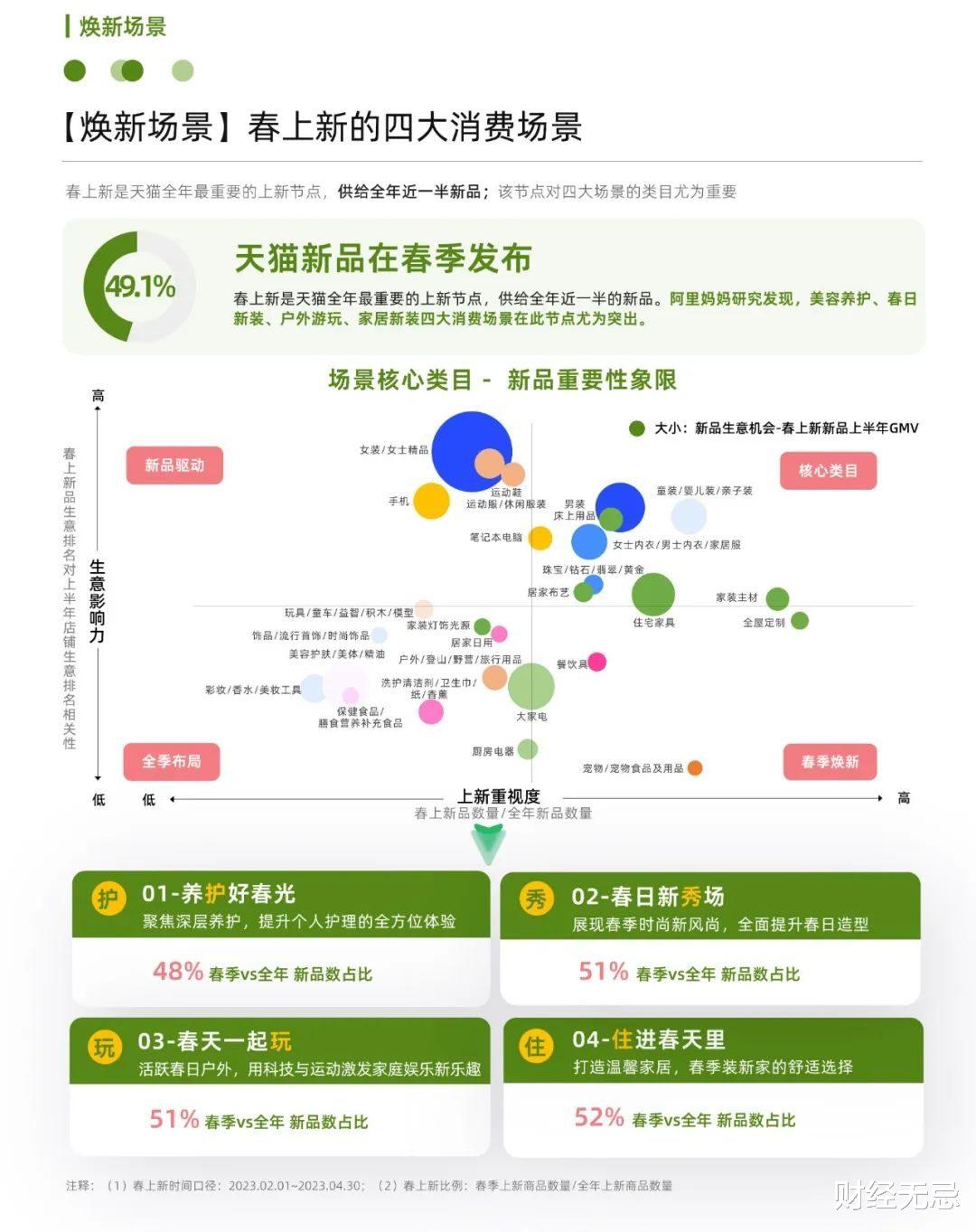 在研究阿里妈妈给出的四大焕新场景的过程中,财经无忌有两点启发:一是春季上新有极强的生意潜能,从部分品类的GMV表现就能看出。二是“焕新”尽管是底层需求,但在消费分化年代,对品牌和商家而言,在上新前,更应厘清每一个趋势背后核心人群的个性化需求,从趋势中来到对的“人”中去。
