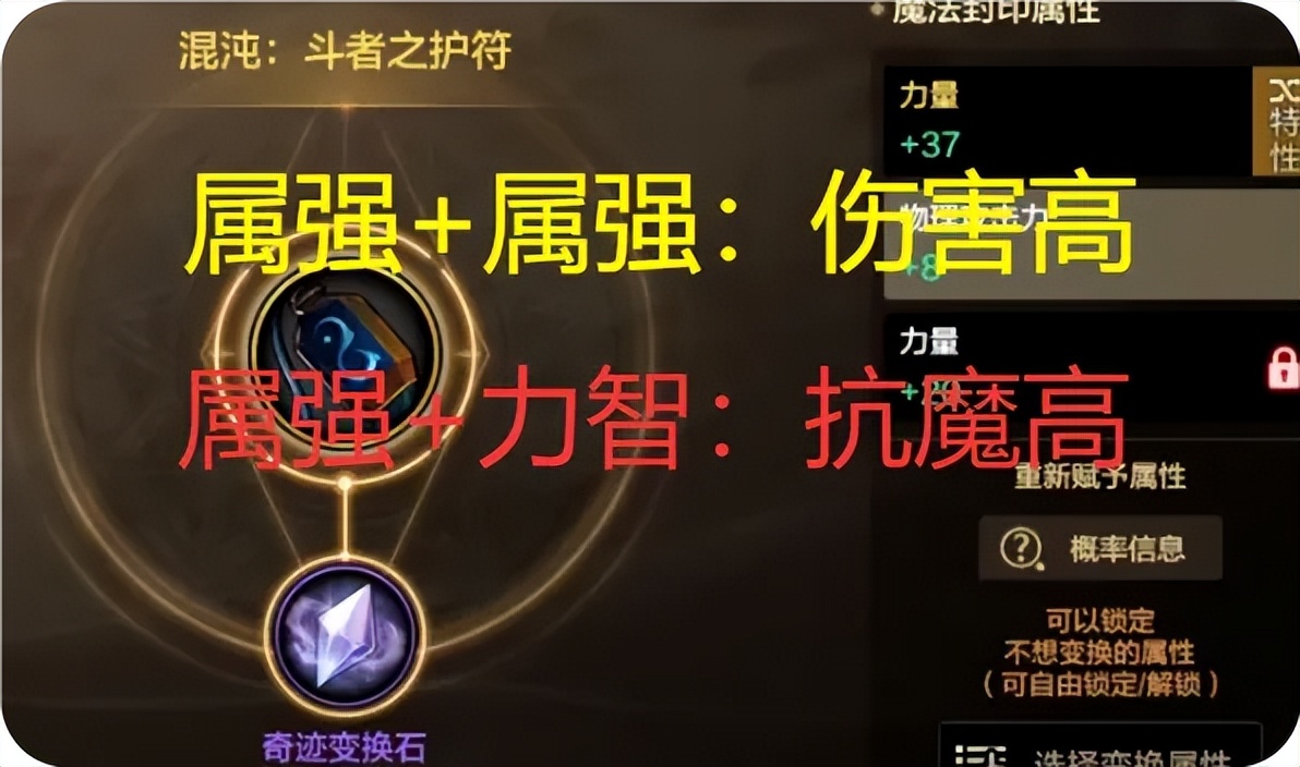 追求伤害肯定选择“属强”,强行堆叠抗魔值可以选择“力智”。