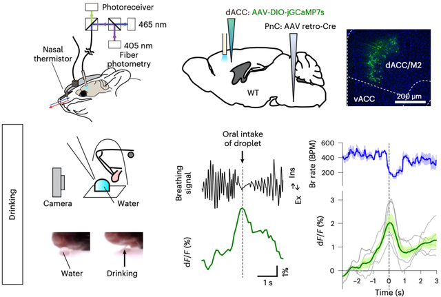 这个实验说明,自主意识行为确实会影响dACC→PnC神经元的活动。此外,他们还证实,dACC→PnC回路可能是协调呼吸周期与自主饮水所必需的。