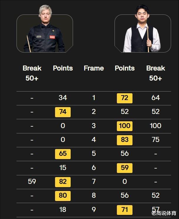 肖国栋在与希尔的对决中,攻防都占据上风,完全掌控了比赛节奏。很快,肖国栋打出五连鞭,连赢五局以5-0横扫对手,第一个拿到四强门票。五局比赛,肖国栋打出两杆破百,两杆50+,希尔总共拿到46分,输球是必然结果。同时开始的囧哥威尔逊与麦克吉尔的比赛,囧哥在开局0-2落后的情况下,5-4完成绝杀,送麦客回家收麦。