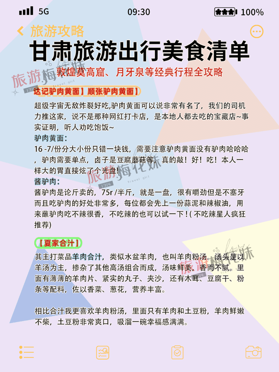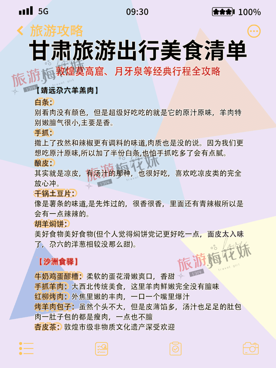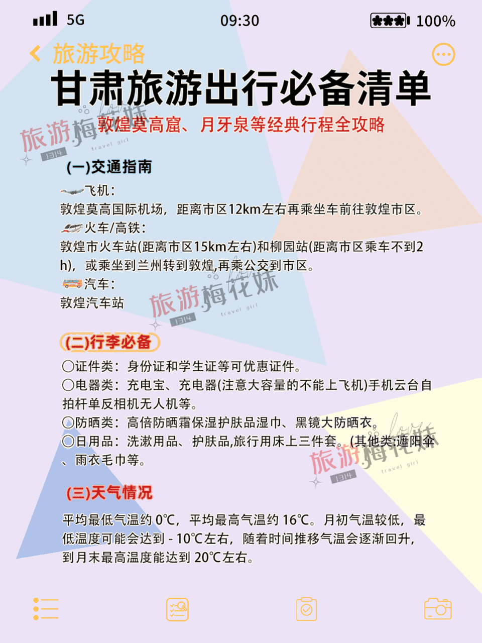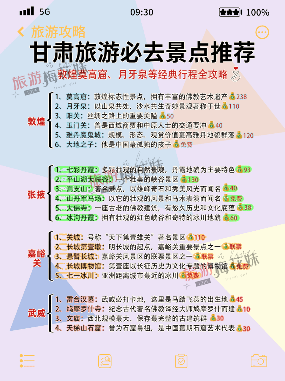 甘肃三天怎么玩 超详细攻略不走冤枉路作为一个去过敦煌莫高窟7次的旅行爱好者,今天要分享一份超详细的甘肃玩法,教你用最科学的路线体验最地道的甘肃!🏰 景点门票必看敦煌景区:🏛️ 莫高窟:238元,标志性佛教艺术圣地🌊 月牙泉:110元,沙水交融的奇迹🏯 阳关:50元,丝绸之路重要关隘🏰 玉门关:40元,历史商贸要冲🏰 雅丹魔鬼城:120元,最震撼地貌群落🌄 大地之子:免费,独特地理奇观张掖景区:🌈 七彩丹霞:93元,绚丽多彩地貌🏔️ 平山湖大峡谷:130元,壮美峡谷⛰️ 嘉支山:40元,奇石风光胜地🐎 山丹军马场:免费,马术表演🏛️ 大佛寺:38元,古老佛教建筑❄️ 冰沟丹霞:60元,红色峡谷地貌🗺️ 行程规划【3日轻松版】D1:兰州→张掖→七彩丹霞→丹霞口度假小镇→嘉峪关D2:嘉峪关→城楼→大地之子→敦煌D3:敦煌→莫高窟→月牙泉→散团【4日精华版】增加玉门关、雅丹魔鬼城等景点【5日深度版】全程不赶,增加沙漠露营体验【6日全景版】完整打卡所有景点,含武威文化游览🚗 交通指南✈️ 飞机:敦煌莫高国际机场(距市区12km)🚂 火车:敦煌站或柳园站(距市区15km)🚌 公交:市区公交便利🎒 必备清单📱 证件:身份证、学生证等优惠证件🔋 电器:充电宝、相机(注意大容量电源不能登机)🕶️ 防晒:高倍防晒霜、墨镜、防晒衣🌡️ 气温提醒:早晚温差大,0-16℃,最低可达-10℃🍜 美食推荐【靖远羊肉】🍖 白条:原汁原味,清香四溢🥘 手抓:配以孜然辣椒,风味独特🥩 酿皮:爽滑可口,开胃解腻【驴肉黄面】💰 人均16-70元,性价比超高🍜 配料:豆腐磨菇,口感绝佳✨ 特色:不辣星人必点💡 避坑提醒1️⃣ 莫高窟门票需提前半月预约2️⃣ 丹霞景区徒步多,务必穿舒适鞋子3️⃣ 景区防晒保湿要做足,紫外线超强4️⃣ 鸣沙山建议选择日出而不是日落5️⃣ 雅丹魔鬼城距市区远,建议包车6️⃣ 带好防沙装备,保护电子设备7️⃣ 补水非常重要,随身携带足够水量#甘肃旅行 #敦煌攻略 #丝绸之路 #莫高窟 #旅行规划 #避坑指南