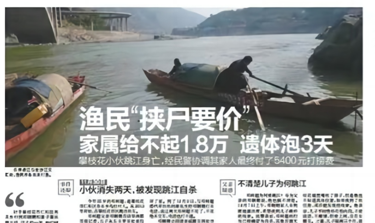 例如,2015年四川某地的一名年轻男子跳江自杀,家属无力支付1.8万元的捞尸费,眼睁睁地看着儿子的尸体在江水中漂了三天。