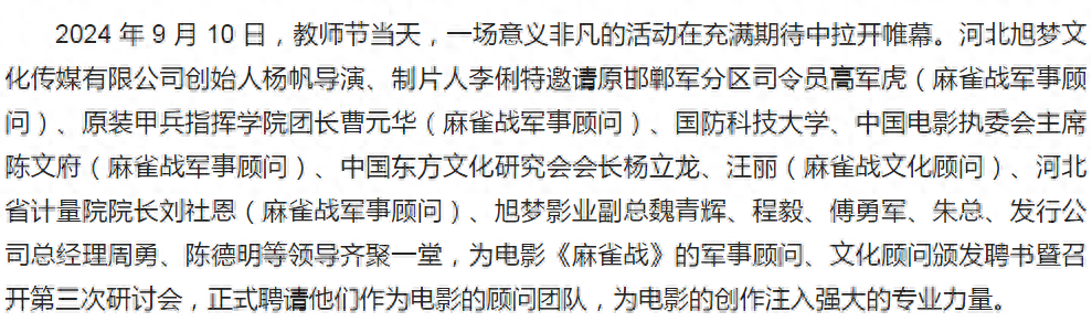 制片人李俐最后讲道,利用多元化的传播渠道和先进的传播技术,将电影《麻雀战》的精彩内容广泛传播,让更多的人了解麻雀战的历史价值和现实意义,激发人们的爱国热情和民族自豪感,为传承红色基因、弘扬革命精神、推动社会进步贡献力量。