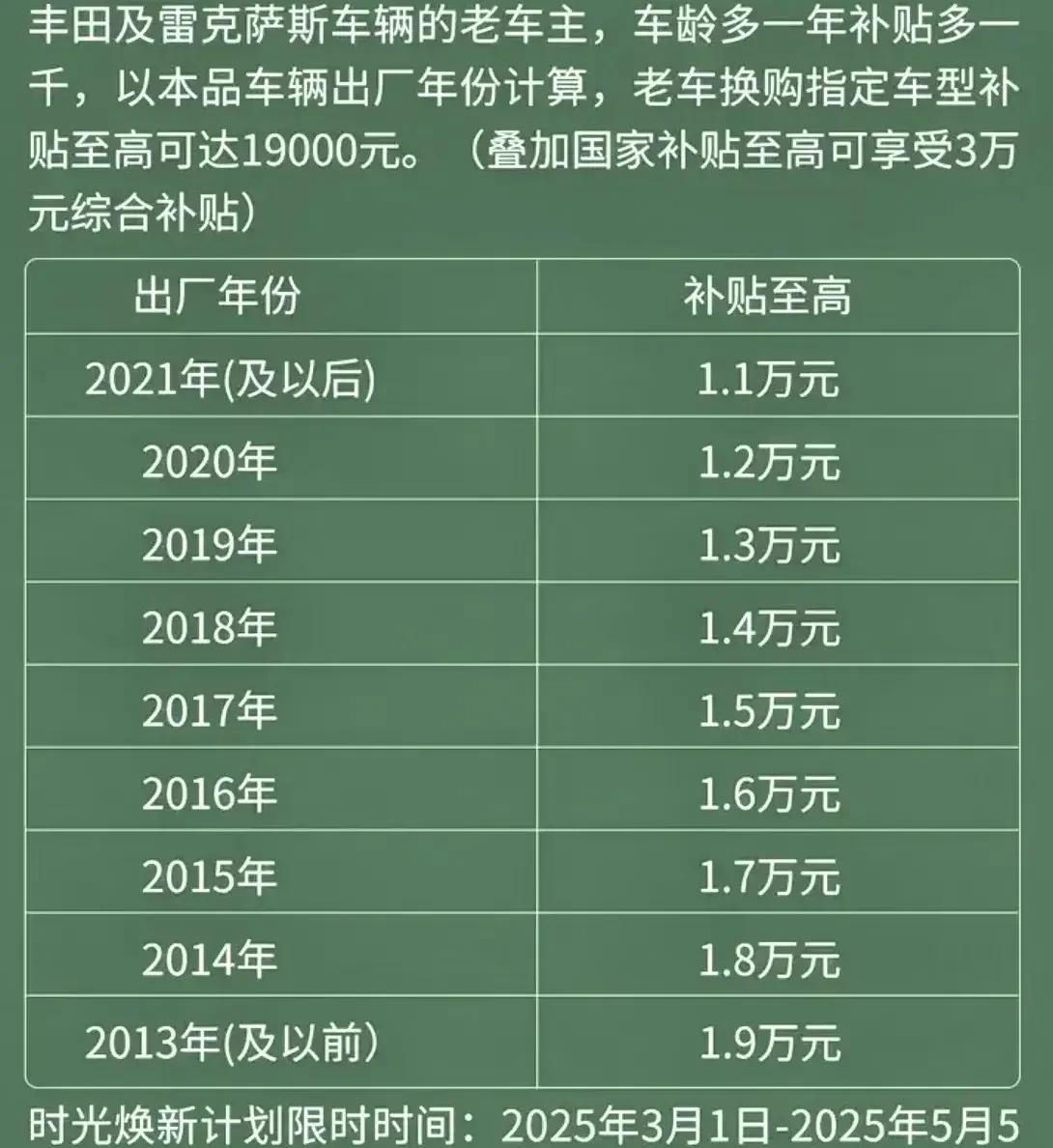 总而言之,2025年的汽车以旧换新政策,加上各大汽车厂商的积极配合,为我们提供了一个千载难逢的换车良机。丰田“时光焕新计划”更是为这个换车季增添了更多吸引力。