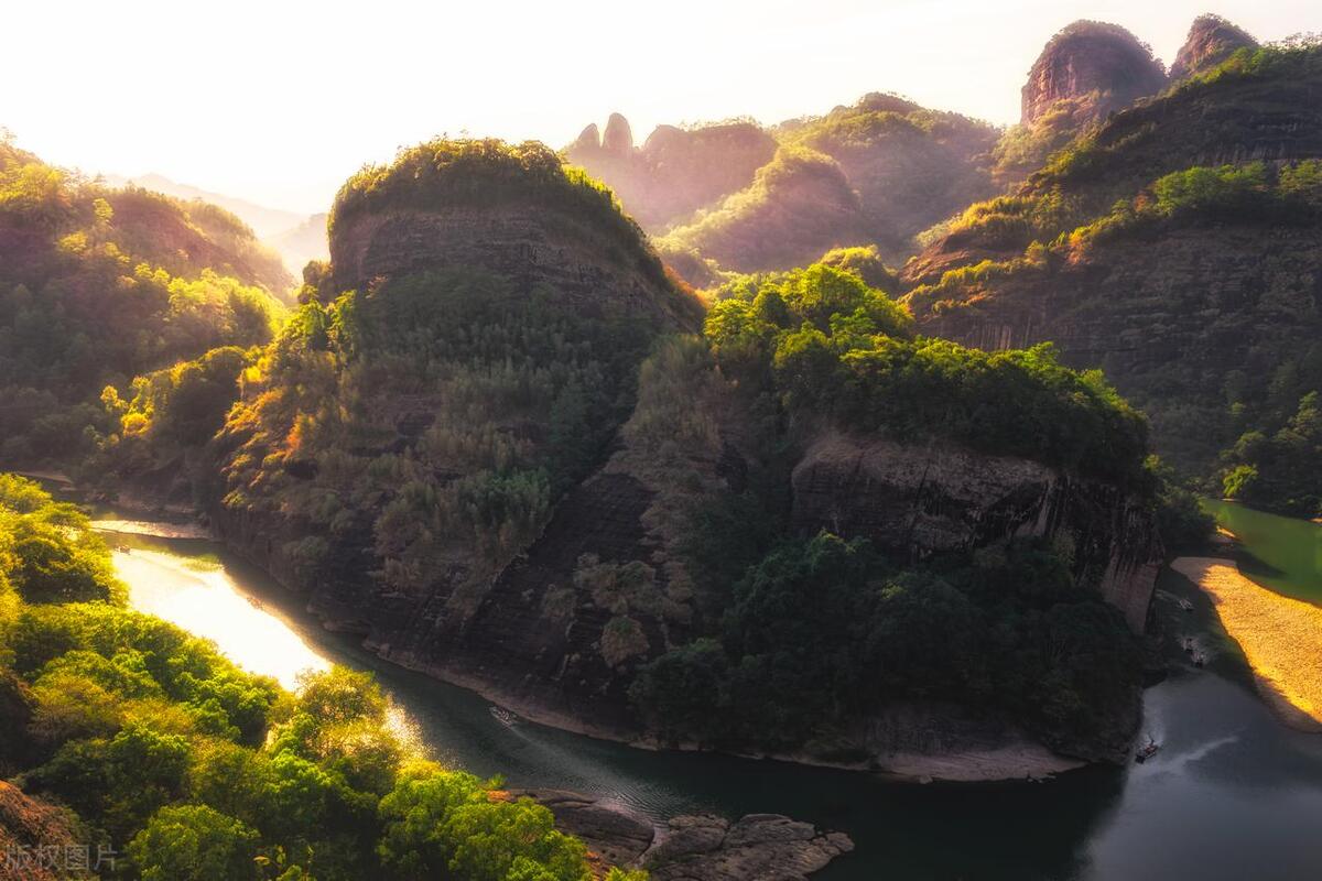 九曲溪,无疑是武夷山的一颗璀璨明珠。沿着九曲溪顺流而下,仿佛置身于一幅流动的山水画卷之中。两岸秀丽的山峰连绵起伏,有的如利剑直插云霄,有的似仙女亭亭玉立,形态各异,令人称奇。清澈的溪水在阳光的照耀下波光粼粼,宛如一条银色的丝带蜿蜒在山间。