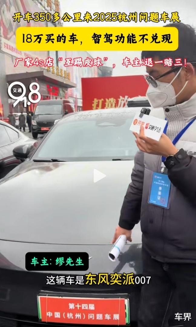 比如,来自江苏南通的【东风奕派】车主表示,其花18万左右买的东风奕派eπ007,智驾功能没有兑现,厂家和4S店互踢皮球。其在接受媒体采访时表示,他买的是有智驾包的,认为厂家涉及虚假宣传,有些功能已经被阉割了,诸如远程挪车、400米自主记忆泊车、一键召唤等和此前宣传不符,而且高速NOA还存在安全隐患,所以他要求智驾包退一赔三。