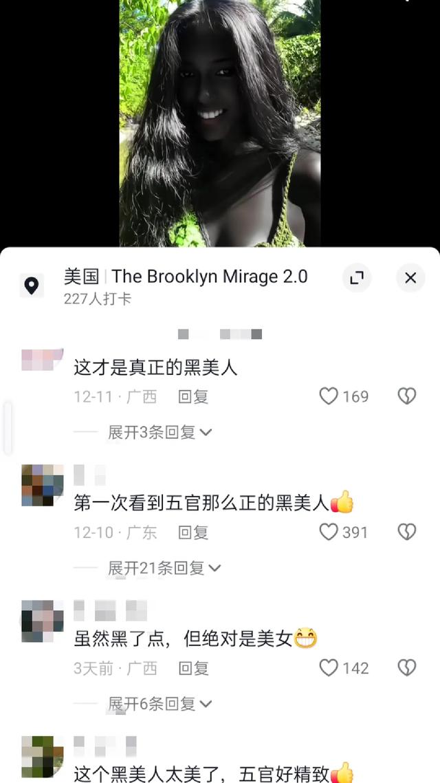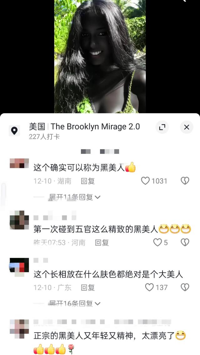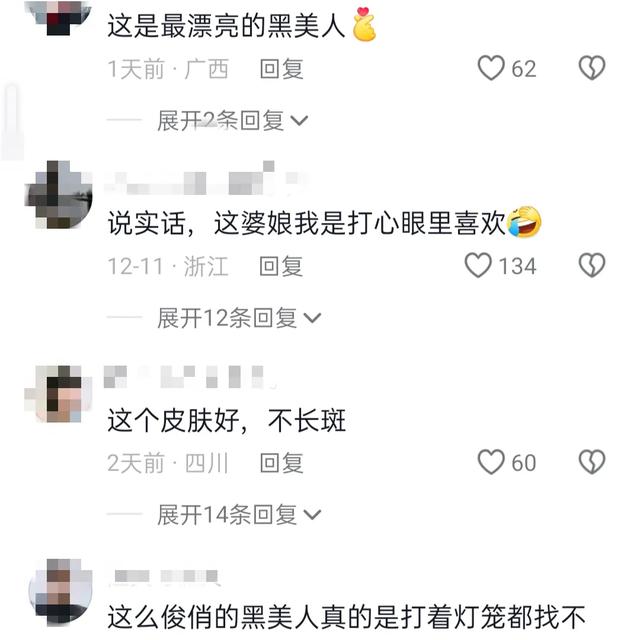 有人说:“这个黑美人太美了,五官好精致,牙齿好白啊!”这句话简单直接地表达了对她外貌精致程度的惊叹。