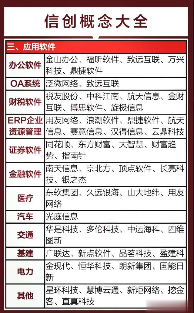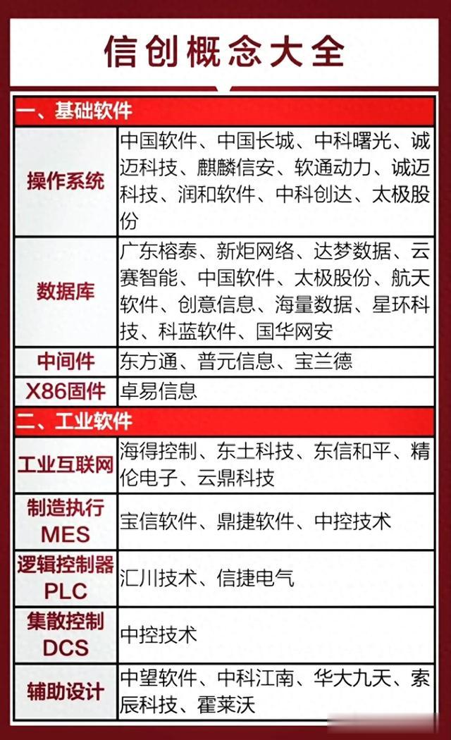 操作系统润和软件、数据库海量数据、工业软件汇川技术、辅助设计华大九天、金融软件南天信息、财税软件金财互联、企业软件用友软件…
