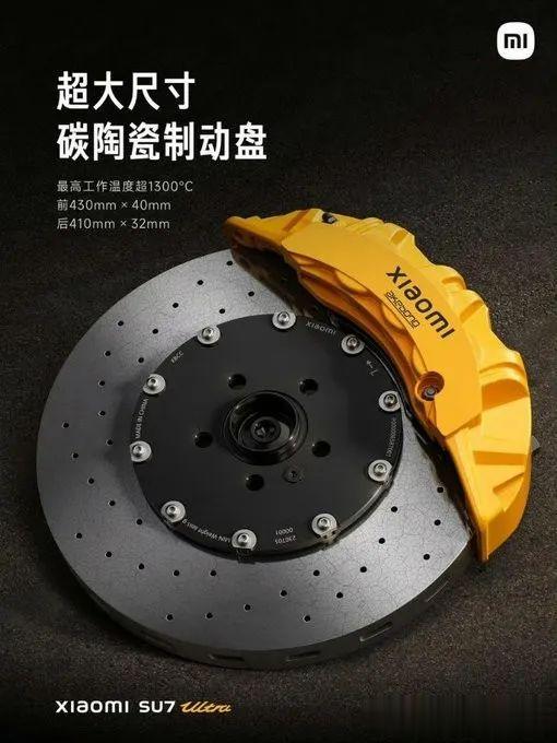 超大尺寸的碳陶瓷制动盘是SU7 Ultra的另一大亮点。前制动盘尺寸为430mm x40mm,后制动盘为410mm x32mm,能够承受超过1300°C的高温。这种高性能制动系统确保了车辆在极限速度下的制动效果,为驾驶者提供了更高的安全保障。