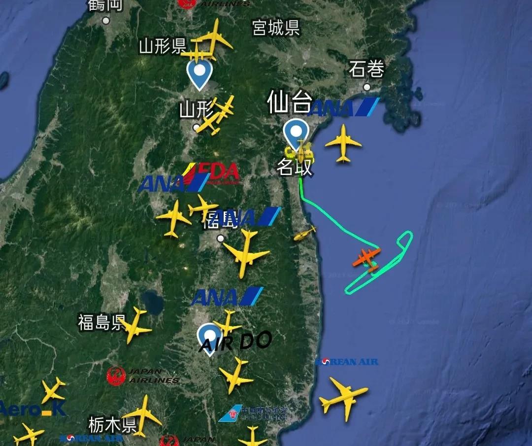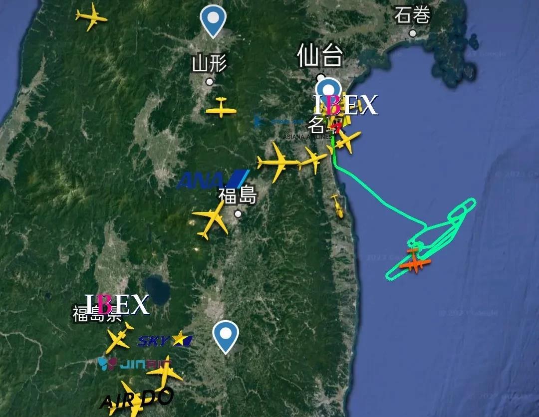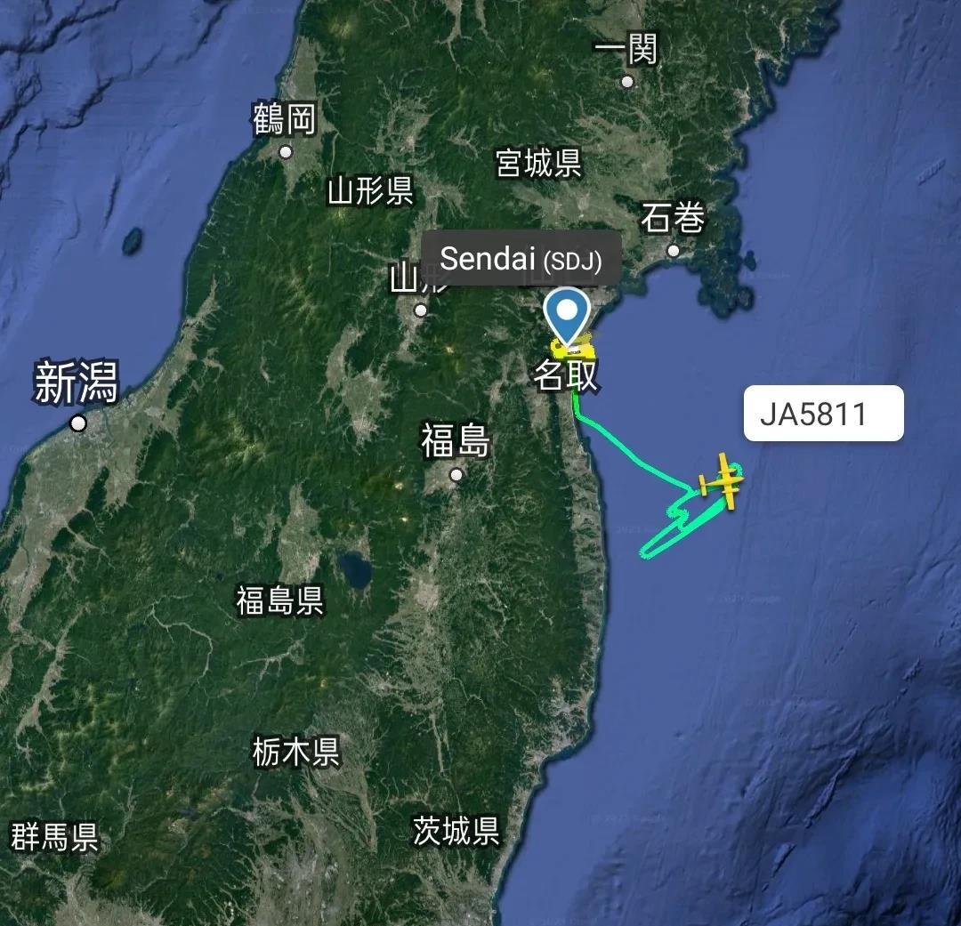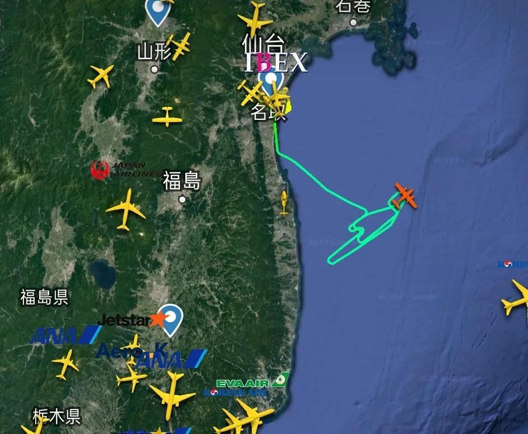该飞机8点16分由日本仙台机场起飞后,到达福岛东部海域位置,正在进行不规则折返飞行,实时坐标37.682N、141.328E。
