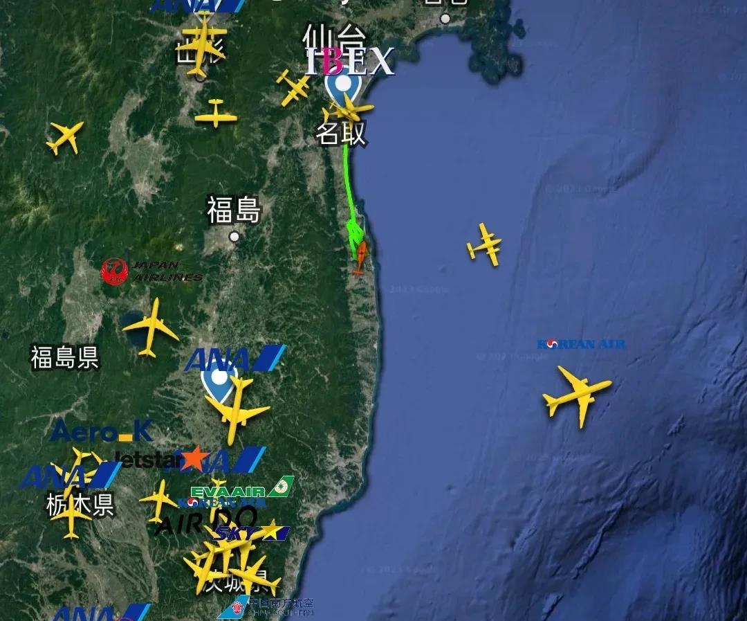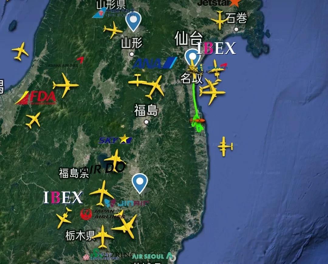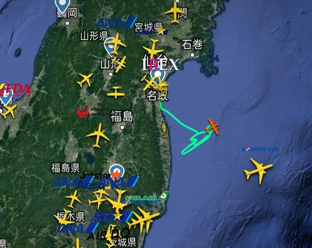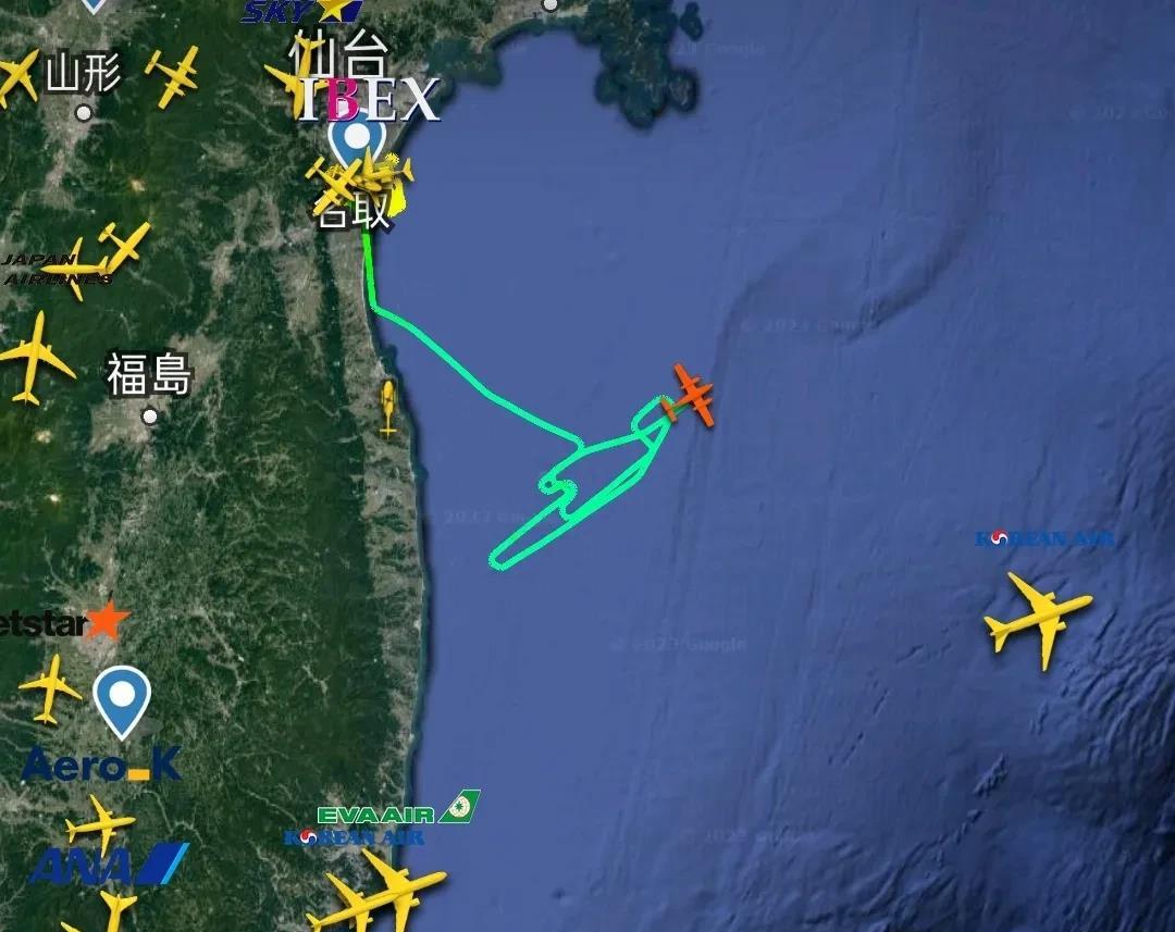 该飞机8点16分由日本仙台机场起飞后,到达福岛东部海域位置,正在进行不规则折返飞行,实时坐标37.682N、141.328E。
