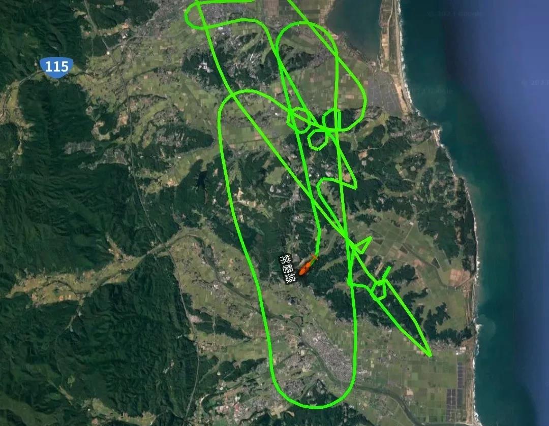 10点35分,该直升机已折返至37.725N、140.946E坐标位置,高度815米,速度159公里/小时。