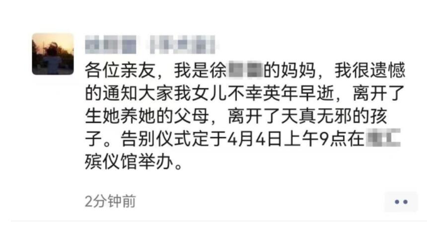 而且这件事是4月1日发生的,直到4月3日这起案件才被通报出来。死者徐某某的母亲发布的朋友圈信息显示,徐某某的告别仪式将在4月4日上午九点举行。