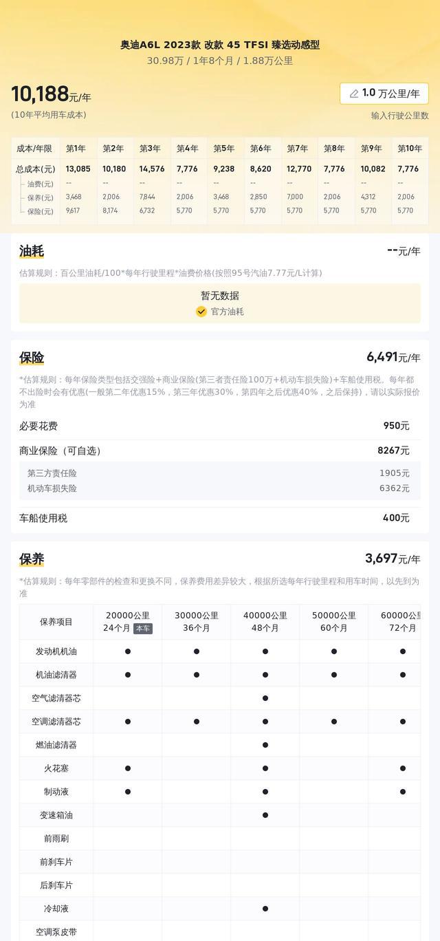 任何车辆都存在用车成本的问题。对于奥迪A6L而言,其10年平均用车成本大约在1.2万元/年左右,虽然这一数据看似并不算高,但具体的使用情况却因人而异。在购车前,消费者如果能够提前了解所需的保险、保养、油耗和相关附加费用,那么在之后的用车过程中就能做到心中有数,避免因预算不足而带来的尴尬局面。