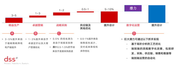 "根据dss+数据统计,减少运营漏损能够给企业带来超过5-10%的利润率的提升。其中,在生产方面带来的提升最为可观。"