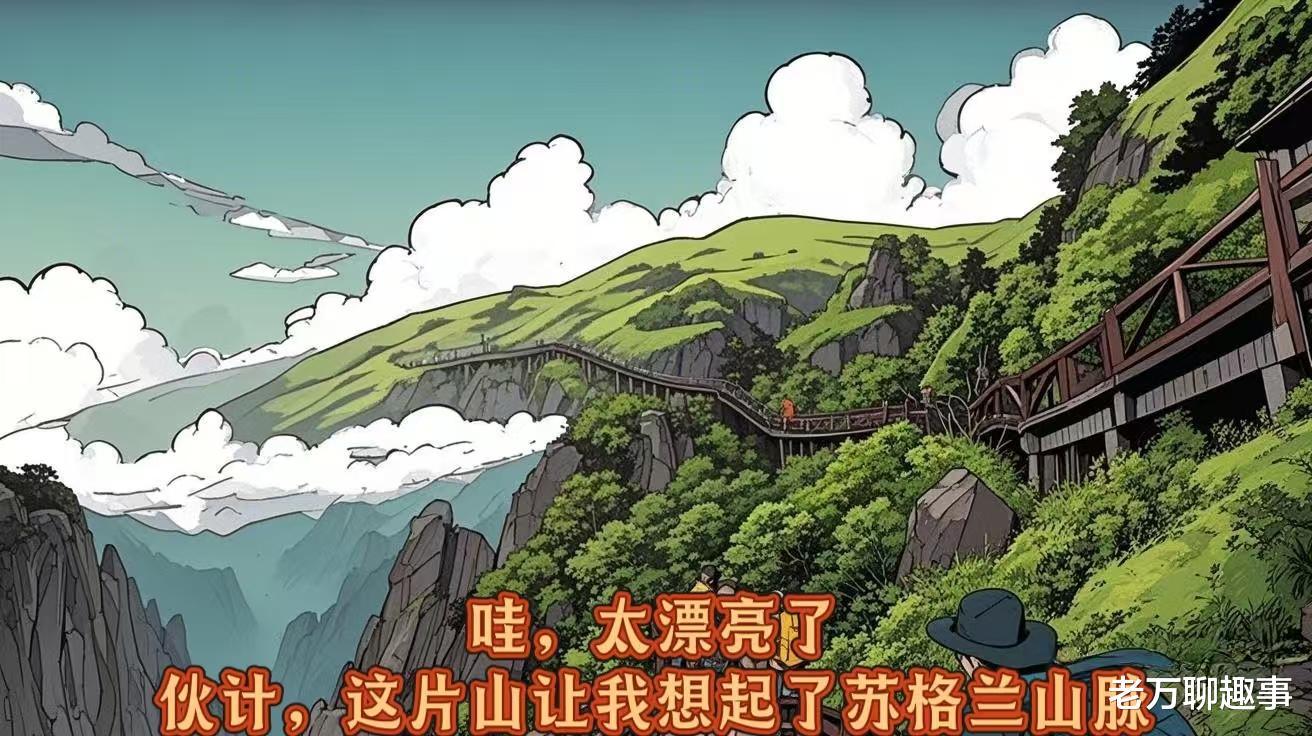 没多久外国博主看见了山顶那片绿油油的草地,那充满生机的景象,让外国博主忽然想起了苏格兰的山脉,还有几分相似的味道。
