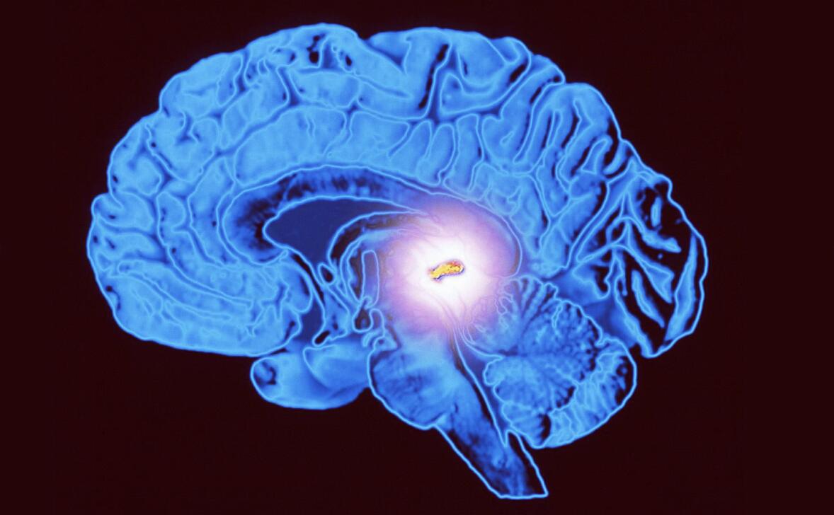 (↑“松果体”位于上丘脑 ,靠近大脑中心区域,其体积很小,长度一般为5至8mm,宽度一般为3至5mm)