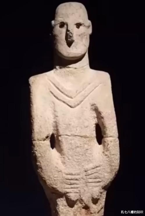 但是在离这不远的一个地方出土的一个石像,这个也是12000年前的石像,他手的动作也是这样的,他呢有脸,有眼睛,没有嘴,也就是说当时的人是具备雕刻脸的技术,他故意没有雕刻脸,很有可能这个东西就是没有脸,或者说这个脸是不固定的,就说这个脸不好描述,于是他就没画这东西,而且这个石像也有问题,说没有嘴,很多人猜测他是用意识进行交流,所以不需要嘴。