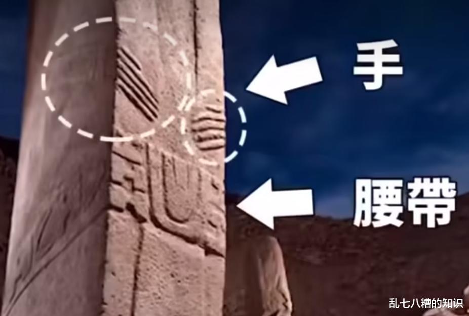 所以现在考古学家们都在猜这玩意是干什么的,为了分析它是干什么用的,很多人就着眼到这些石头上的雕刻了,这个T形石上面都雕有人的手和腰带,和复活节岛上石像的动作是一样的,于是考古学家马上去猜测这个T形石每一个代表都是人,特别巨大的人,上面这个横着的石头代表着人头,竖着就是人身,但是奇怪的是横着石头上没有鼻子,没有眼,那我们可能就想象说他们可能觉得雕刻人脸比较麻烦,所以就没雕刻。