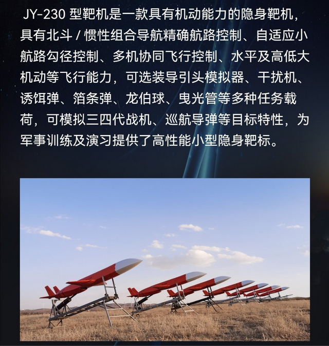 大机动高亚音速隐身靶机。与JY-230在外观上非常相似,但尺寸相比JY-230来说,稍微大一点。RCS特性:0.01㎡~3㎡(可调),机动过载:6g。