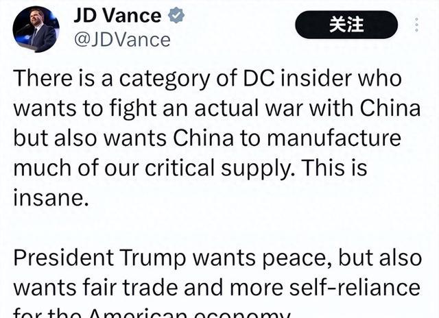 前几天,美国副总统万斯在其社交媒体上发表言论称,当前的华盛顿特区内,有一些政客既想让中国为美国提供商品,又想和中国动武,这种想法跟疯子没什么区别。