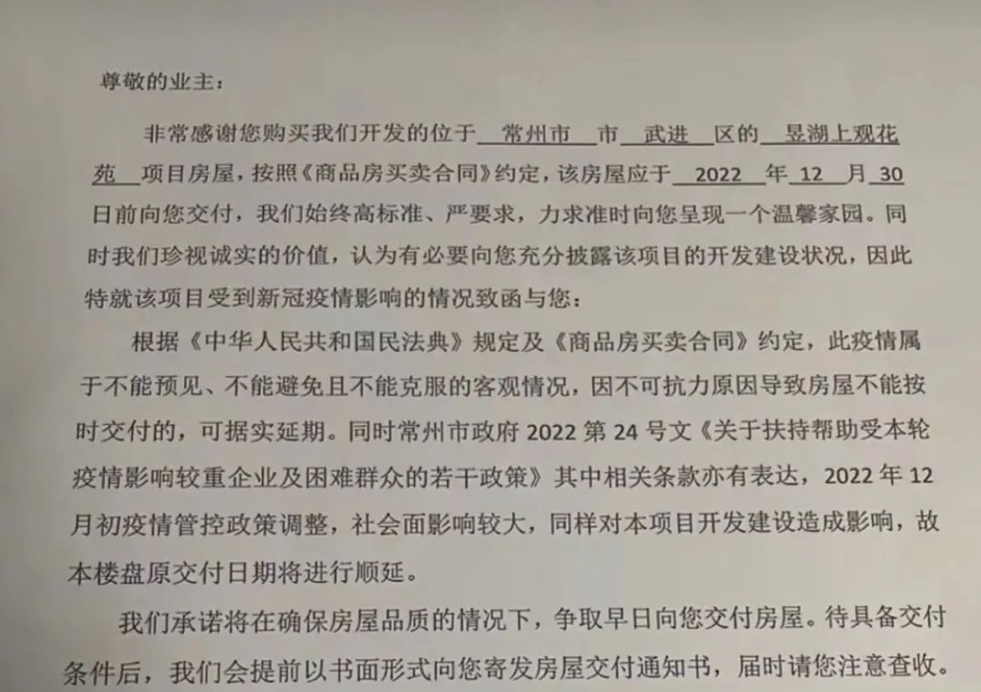 都说新年新气象,新年可以带来好运,常州这批业主可没有这么幸运。NO. 1|壹业主气炸了,都2023年了,常州又有一家楼盘传来了延期交付的信息。近日,位于经开区遥观板块的弘阳昱湖上观正式发出延期交付通知,原本预计在12月30日完成交付的他们,官方称受到疫情管控政策调整,受社会面影响较大,交付日期将进行顺延。不过在交付通知中,并未提及后续确认可交付的明确日期,项目交付呈现出遥遥无期的状态。