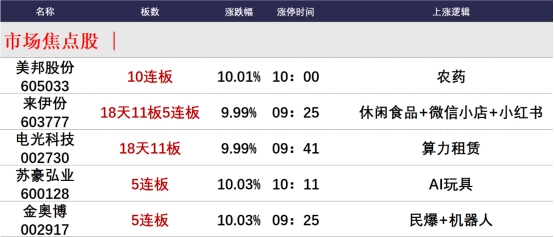 二是,今日涨停加速板65只,连板股总数26只,25股封板未遂,封板率为72%。焦点股方面,农业股美邦股份10连板领涨,小红书概念股来伊份5连板上演18天11板,利欧股份7天5板。
