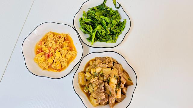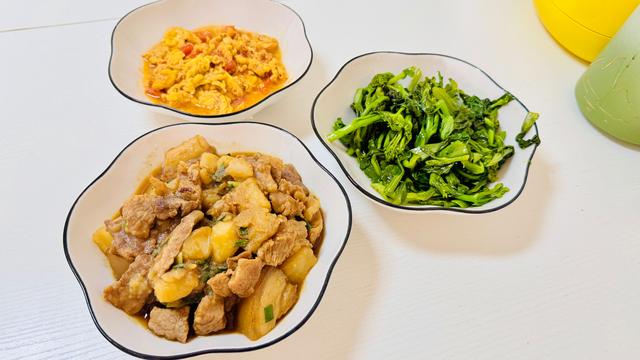 猪肉炒土豆块,锅里不放油,先把猪肉炒出香味,加一点生抽炒上色,倒入土豆块炒至断生之后加适量开水焖一会,最后加盐提味,撒上一点香葱就可以出锅了。土豆炖软烂之后拌饭是真的很香,很下饭。