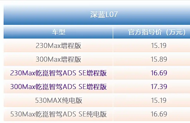 深蓝L07的厂商指导价为15.19万元-16.69万元,搭载乾崑智驾ADS SE的两款增程车型指导价为16.69万元和17.39万元,相比其它华为智驾车型动辄30万元起的售价来说,深蓝L07在价格上确实非常实惠,很适合刚入社会的年轻消费者和喜欢华为智驾的普通消费者。