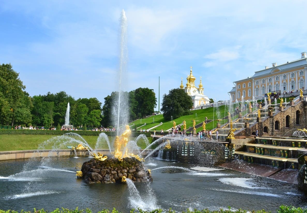喷泉的水柱高达 66 英尺,周围环绕着八只海豚,海豚的嘴里喷出水来。这座美丽的喷泉于 1735 年揭幕,以纪念波尔塔瓦战役 25 周年,彼得一世的军队在大北方战争期间击败了瑞典军队。