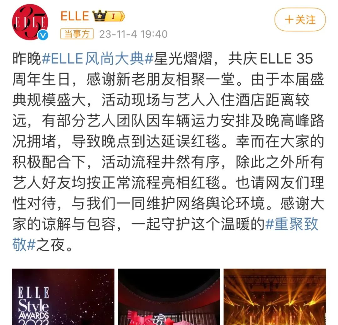 还有更有趣的,前央视主持人李思思,从央视离职后首次公开亮相,来担任内场主持,就被站姐错认成杨紫。随后又传闻称,有明星为了压轴争咖位,耍大牌,迟迟不肯上场,导致主持人一个人在台上空等了近六分钟,还一度词穷。至于是哪家明星,就不得而知了。事后矛头指向的 ,也都各有说辞,最终不出所料,以ELLE官方的几句辟谣回应告终,只留下粉丝激烈互掐。
