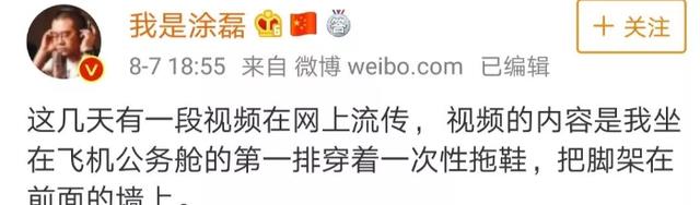 2019年,有网友在飞机上,拍到了涂磊的“不雅动作”,他将两只脚伸在了前方物体的高处。