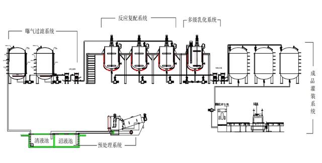 整套生产系统由沼液预处理系统、曝气过滤系统、反应复配系统、温度控制系统、成品包装系统、PLC控制系统等部分组成。