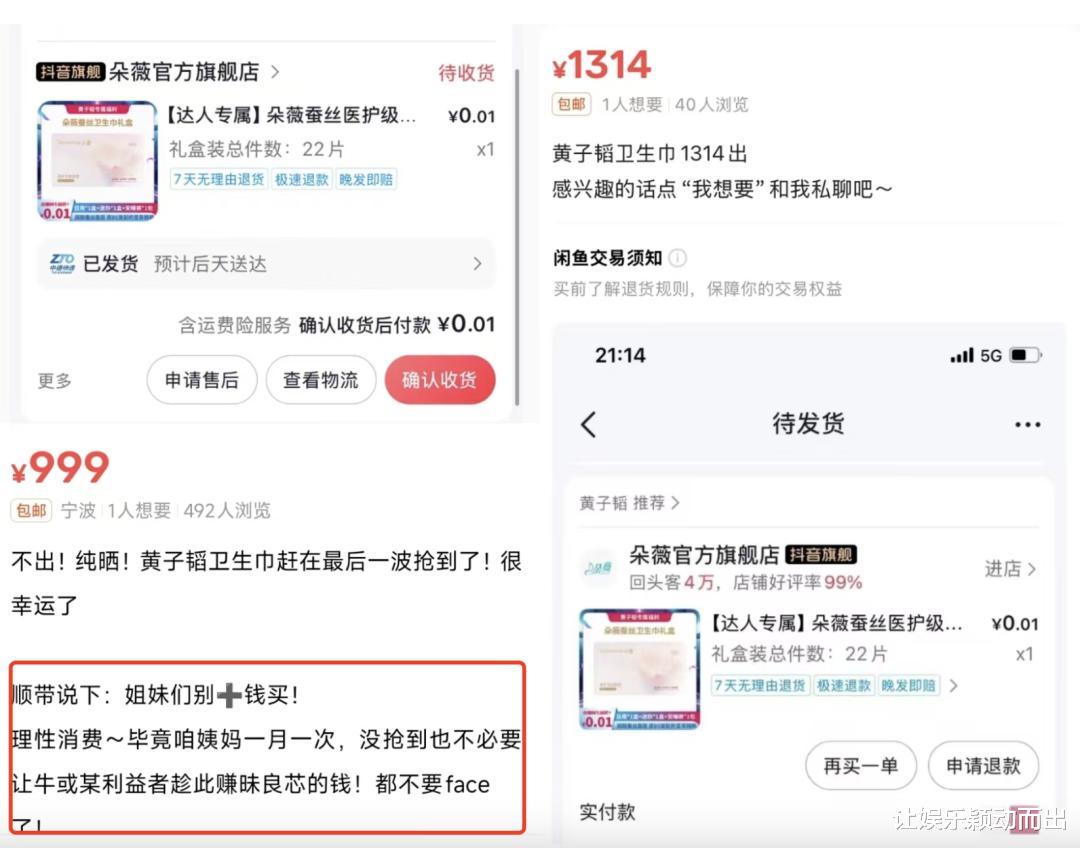 与此同时,涌入直播间的黄牛在二手交易平台闲鱼上同步上线了许多标价69元、99元的黄子韬卫生巾购买链接。尽管黄子韬及工作人员在直播间内再三强调,请把卫生巾让给真正有需要的用户,依旧无法阻止二手平台的倒卖行为。